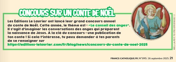 Dans son numéro du 26 septembre 2025 (n°3915), France Catholique présente le concours de conte de Noël 2025 et invite ses jeunes lecteurs à y participer !